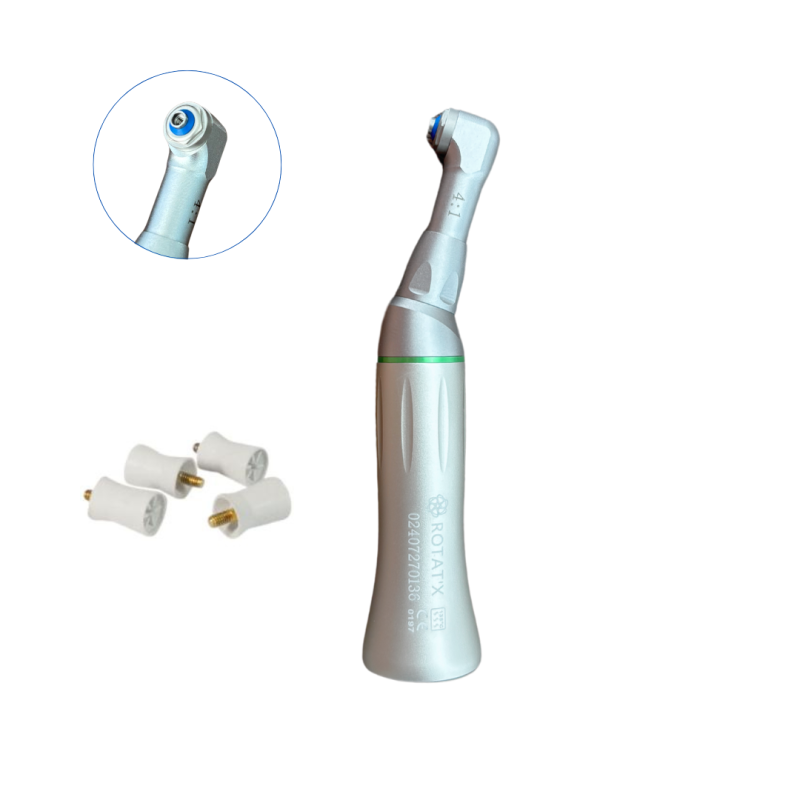 Optimisez vos soins dentaires avec ce contre-angle vert de polissage de haute qualité, spécialement conçu pour un usage avec des cupules et polissoirs à vis. Ce modèle au rapport de réduction de 4:1 est idéal pour des rotations précises et une finition soignée.